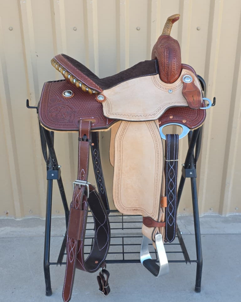 This saddle is built on a wooden rawhide covered tree and comes with a latigo, back flank, stirrups, back billets and offstrap. To order give us a call or email us. We take Visa, Mastercard and Discover. On any saddle, we can add your brand, custom lettering, upgraded conchos, upgraded stirrups, etc. Trophy lettering is available for $50 as well on any saddle.
