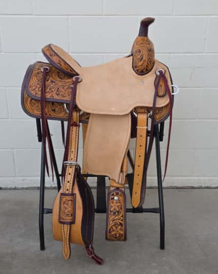This saddle is built on a wooden rawhide covered tree and comes with a latigo, back flank, stirrups, back billits and offstrap. To order give us a call or email us. We take Visa, Mastercard and Discover. On any saddle, we can add your brand, custom lettering, upgraded conchos, upgraded stirrups, etc. Trophy lettering is available for $50 as well on any saddle. Trophy lettering can be painted the color of your choice.