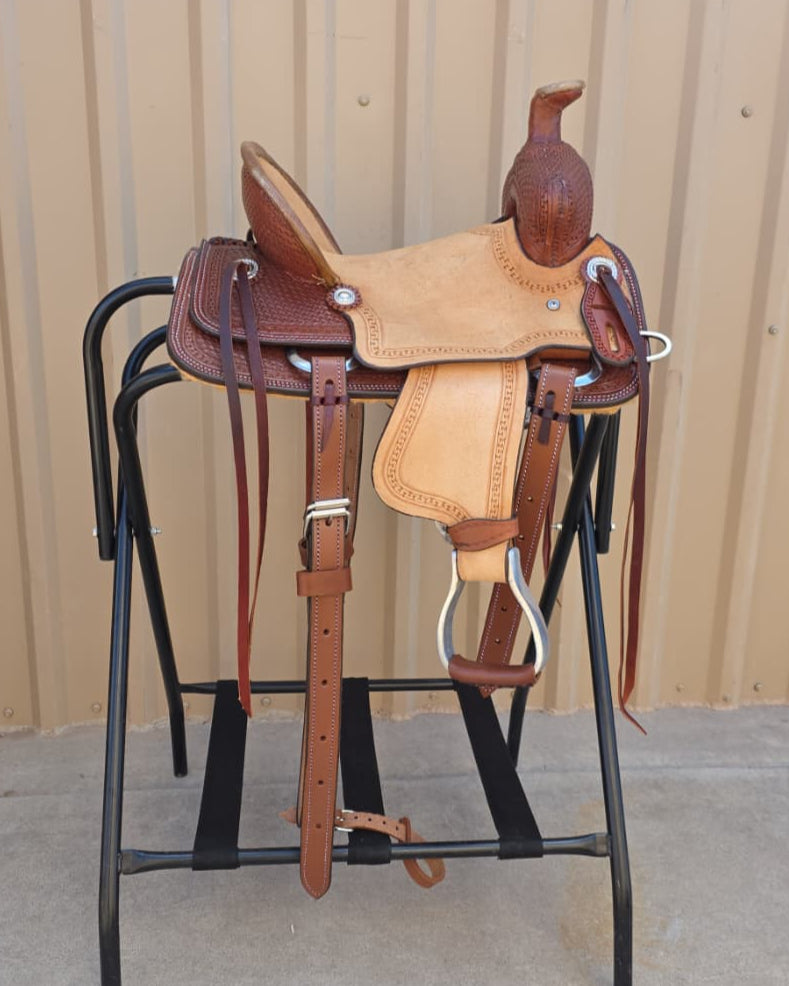 This saddle is built on a wooden rawhide covered tree and comes with a latigo, back flank, stirrups, back billits and offstrap. To order give us a call or email us. We take Visa, Mastercard and Discover. On any saddle, we can add your brand, custom lettering, upgraded conchos, upgraded stirrups, etc. Trophy lettering is available for $50 as well on any saddle.