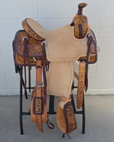 This saddle is built on a wooden rawhide covered tree and comes with a latigo, back flank, stirrups, back billits and offstrap. To order give us a call or email us. We take Visa, Mastercard and Discover. On any saddle, we can add your brand, custom lettering, upgraded conchos, upgraded stirrups, etc. Trophy lettering is available for $50 as well on any saddle.