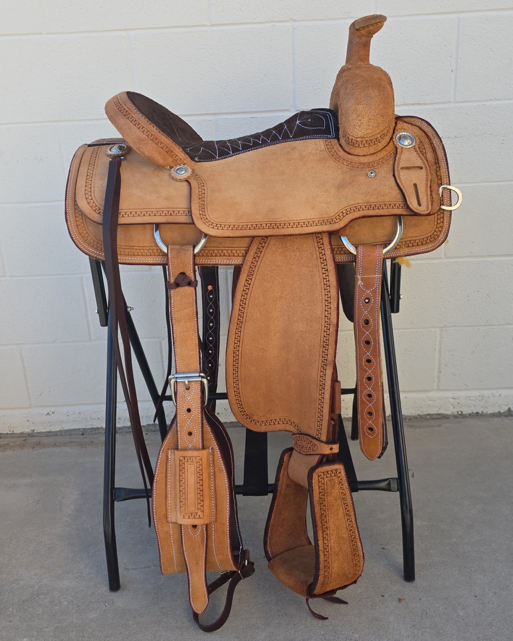 This saddle is built on a wooden rawhide covered tree and comes with a latigo, back flank, stirrups, back billits and offstrap. We take Visa, Mastercard and Discover. On any saddle, we can add your brand, custom lettering, upgraded conchos, upgraded stirrups, etc. Trophy lettering is available for $50 as well on any saddle.