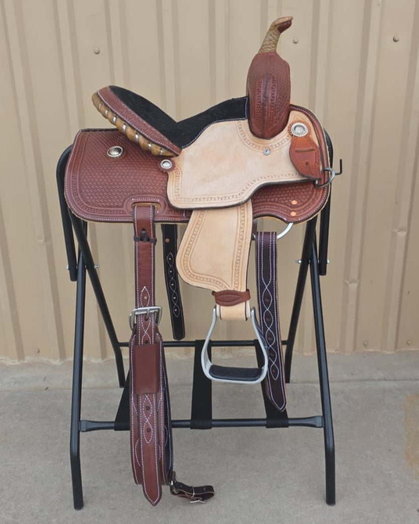 This saddle is built on a wooden rawhide covered tree and comes with a latigo, back flank, stirrups, back billits and offstrap. To order give us a call or email us. We take Visa, Mastercard and Discover. On any saddle, we can add your brand, custom lettering, upgraded conchos, upgraded stirrups, etc. Trophy lettering is available for $50 as well on any saddle.