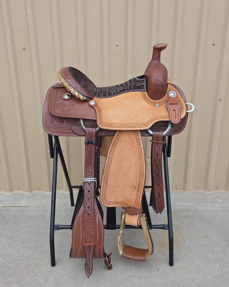 This saddle is built on a wooden rawhide covered tree and comes with a latigo, back flank, stirrups, back billits and offstrap. To order give us a call or email us. We take Visa, Mastercard and Discover. On any saddle, we can add your brand, custom lettering, upgraded conchos, upgraded stirrups, etc. Trophy lettering is available for $50 as well on any saddle.