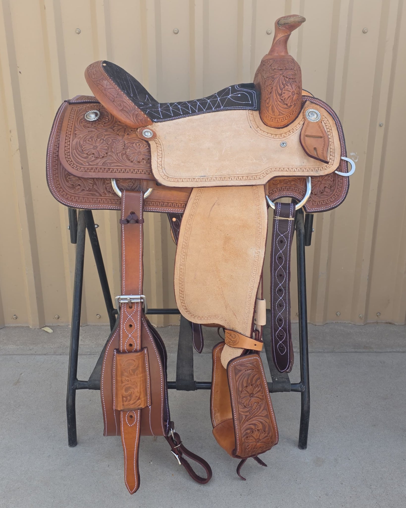This saddle is built on a wooden rawhide covered tree and comes with a latigo, back flank, stirrups, back billits and offstrap. To order give us a call or email us. We take Visa, Mastercard and Discover. On any saddle, we can add your brand, custom lettering, upgraded conchos, upgraded stirrups, etc. Trophy lettering is available for $50 as well on any saddle.
