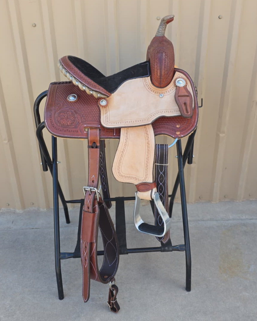 This saddle is built on a wooden rawhide covered tree and comes with a latigo, back flank, stirrups, back billits and offstrap. To order give us a call or email us. We take Visa, Mastercard and Discover. On any saddle, we can add your brand, custom lettering, upgraded conchos, upgraded stirrups, etc. Trophy lettering is available for $50 as well on any saddle.