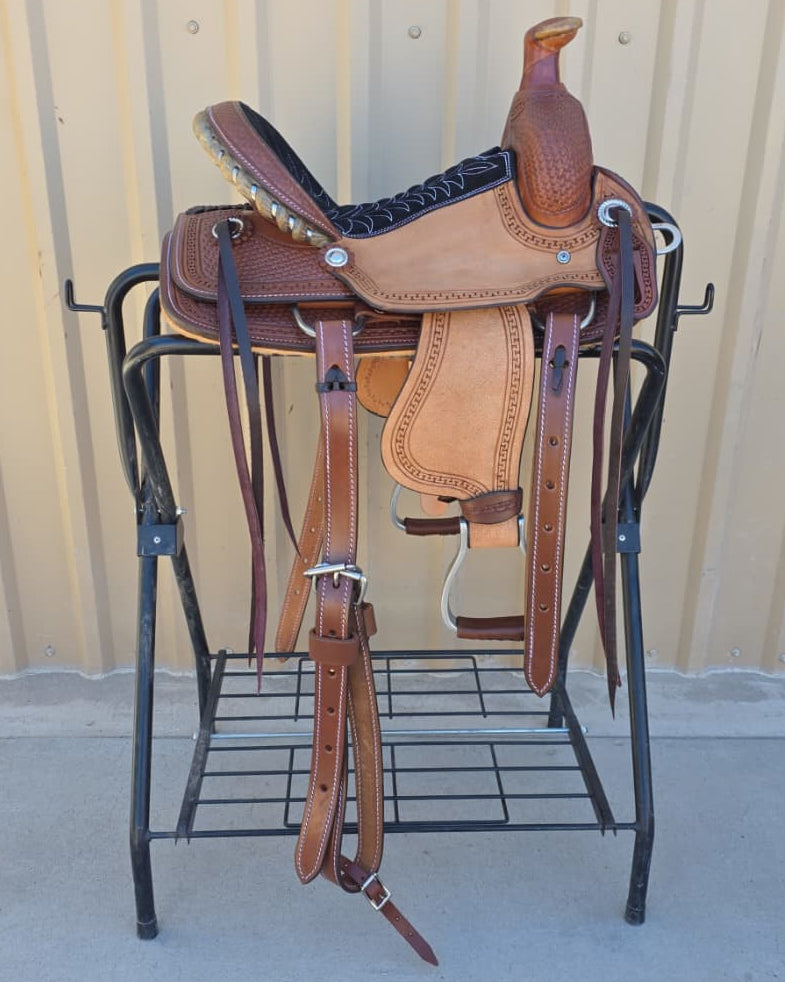 This saddle is built on a wooden rawhide covered tree and comes with a latigo, back flank, stirrups, back billits and offstrap. To order give us a call or email us. We take Visa, Mastercard and Discover. On any saddle, we can add your brand, custom lettering, upgraded conchos, upgraded stirrups, etc. Trophy lettering is available for $50 as well on any saddle.