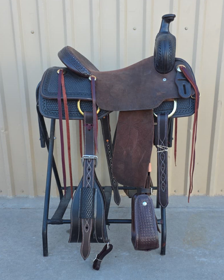 This saddle is built on a wooden rawhide covered tree and comes with a latigo, back flank, stirrups, back billits and offstrap. To order give us a call or email us. We take Visa, Mastercard and Discover. On any saddle, we can add your brand, custom lettering, upgraded conchos, upgraded stirrups, etc. Trophy lettering is available for $50 as well on any saddle.
