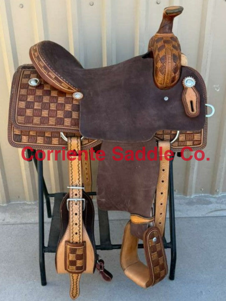 This saddle is built on a wooden rawhide covered tree and comes with a latigo, back flank, stirrups, back billets and offstrap. To order give us a call or email us and we will get started on one for you. We take Visa, Mastercard and Discover. We offer seat sizes 14" inch, 14.5" inch, 15" inch, 15.5" inch, 16" inch, 16.5 inch, 17" inch, and 18" inch in this saddle. On any saddle, we can add your brand, custom lettering, upgraded conchos, upgraded stirrups, etc. Trophy lettering is available for $50 as well on any saddle. Seat can be changed to a solid color suede seat of your choice.