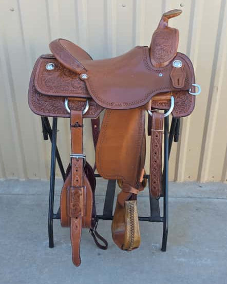 This saddle is built on a wooden rawhide covered tree and comes with a latigo, back flank, stirrups, back billits and offstrap. To order give us a call or email us. We take Visa, Mastercard and Discover. On any saddle, we can add your brand, custom lettering, upgraded conchos, upgraded stirrups, etc. Trophy lettering is available for $50 as well on any saddle.