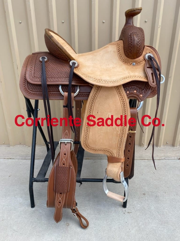 This saddle is built on a wooden rawhide covered tree and comes with a latigo, back flank, stirrups, back billits and offstrap. To order give us a call or email us and we will get started on one for you. We take Visa, Mastercard and Discover. We offer seat sizes 14" inch, 14.5" inch, 15" inch, 15.5" inch, 16" inch, 16.5 inch, 17" inch, and 18" inch in this saddle. On any saddle, we can add your brand, custom lettering, upgraded conchos, upgraded stirrups, etc. Trophy lettering is available for $50 as well on any saddle.