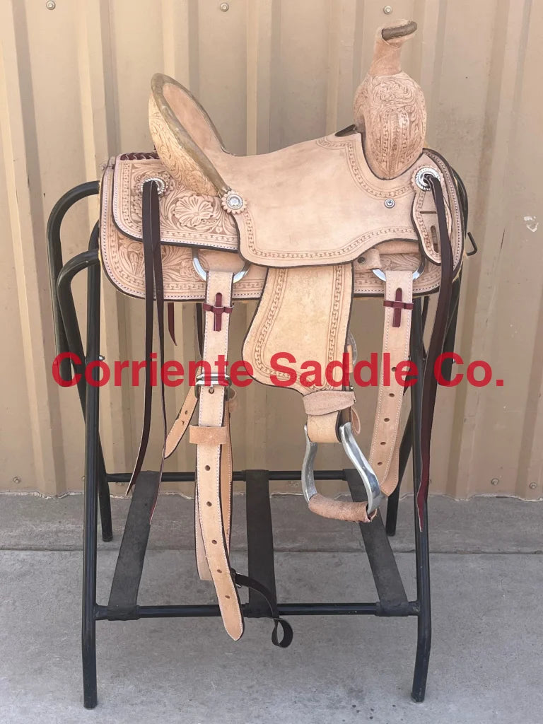 This saddle is built on a wooden rawhide covered tree and comes with a latigo, back flank, stirrups, back billets and offstrap. To order give us a call or email us and we will get started on one for you. We take Visa, Mastercard and Discover. On any saddle, we can add your brand, custom lettering, upgraded conchos, upgraded stirrups, etc. Trophy lettering is available for $50 as well on any saddle.